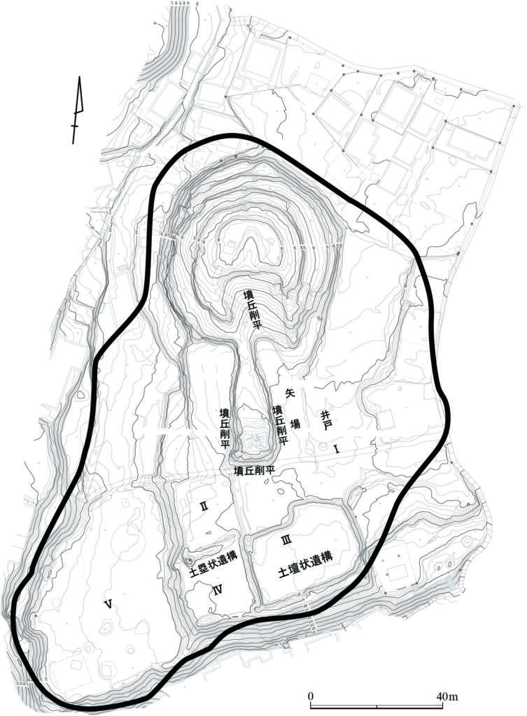 範囲内は、南北に並ぶ日下ヶ塚古墳の墳丘とⅢ土壇状遺構(東西約36m×南北約24m、高さ約1.5~2.8m)を最高所とし、西方の土塁状遺構・区画溝で区画されるⅡ・Ⅳから、Ⅴへ向けて3段に下降する構造を持っています。その広がりは東西約110mであり、北西側から全景を描いた『水戸天狗党絵巻』と同様の構造を確認することができます。古墳の前方部三方、及び後円部南方が削られていますが、明治前期の迅速測図にはすでに表現されており、江戸後期の海防陣屋の築造に伴い削平された姿を残していると考えることができます。海防陣屋の範囲では、近代以降の改変をほとんど受けることなく、上記のような近世遺構が遺存しているものとみられます。