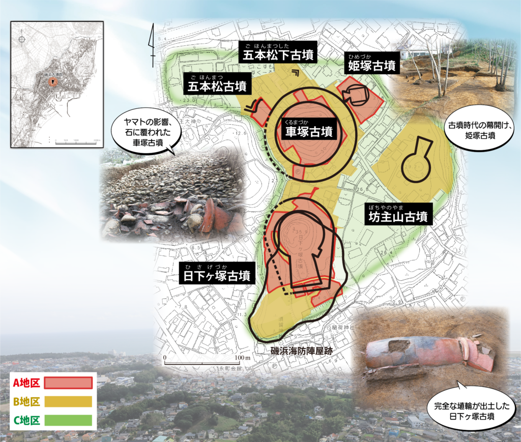 磯浜古墳群は、日本の歴史理解に欠くことのできない学術上価値のあるものと評価され、令和2年3月10日、A地区(赤)が国史跡に指定されました。