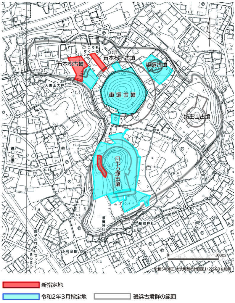 令和8年2月17日、文化財保護法第109条第1項の規定に基づき、国史跡磯浜古墳群(令和2年3月10日指定)に、3筆の土地(図のオレンジ色の部分)が追加指定されました。