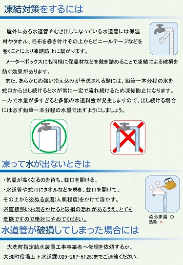 強い寒気の影響により、気温が氷点下になると水道管内の水が凍結し水が出なくなったり、水道管が破損し修理に多額の費用が掛かる事例が発生しています。