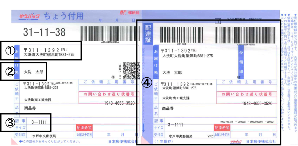 ④配達証…郵便局でお届けの際に剥がして回収します。
