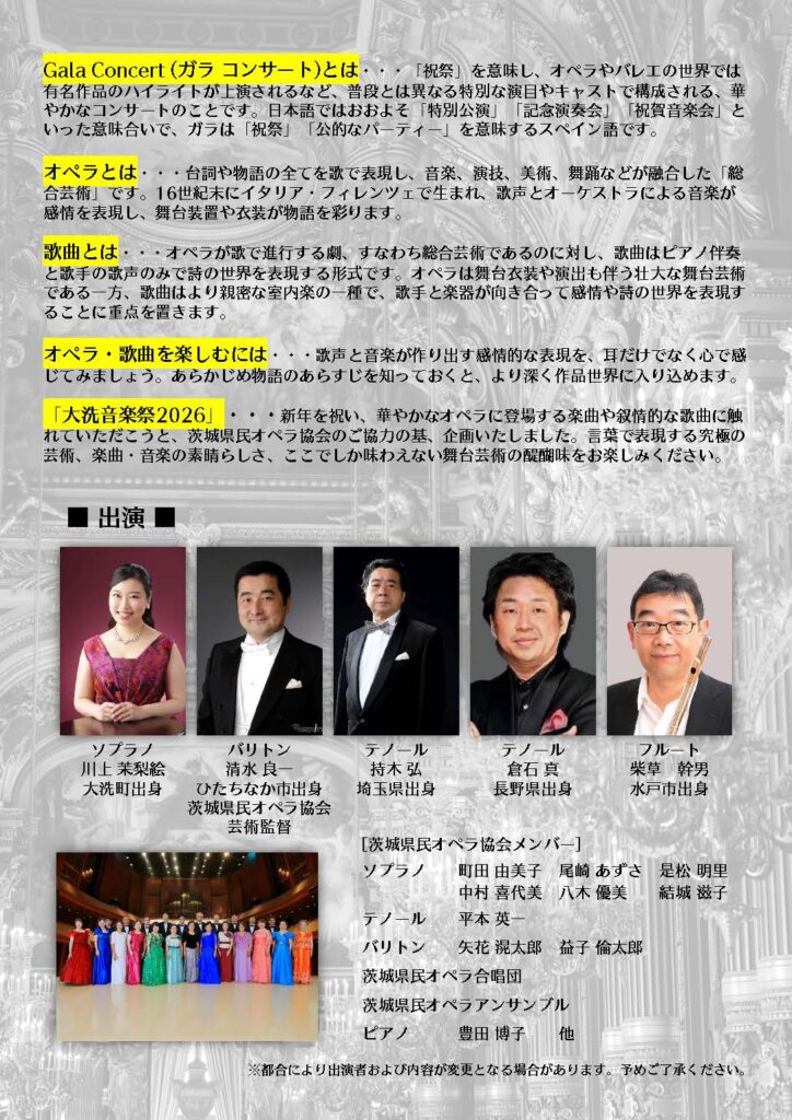 2025/12/15 生涯学習課|文化振興係 大洗音楽祭2026開催のお知らせ 1月18日(日曜日)13時30分より、トヨペット スマイルホール 大洗(町民会館)で、大洗音楽祭2026を開催いたします。 <出演者> ソプラノ歌手 川上 茉莉絵 バリトン歌手 清水 良一 テノール歌手 持木 弘 倉石 真 フルート奏者 芝草 幹男 茨城県民オペラ協会メンバー 他 以上の方々が出演予定しておりますので是非お越しください。 お問い合せ 生涯学習課 文化振興係 代表電話番号 029-267-5111 FAX 029-267-1051 Mail お問合せフォーム 新着情報一覧へ戻る SNSでシェアする